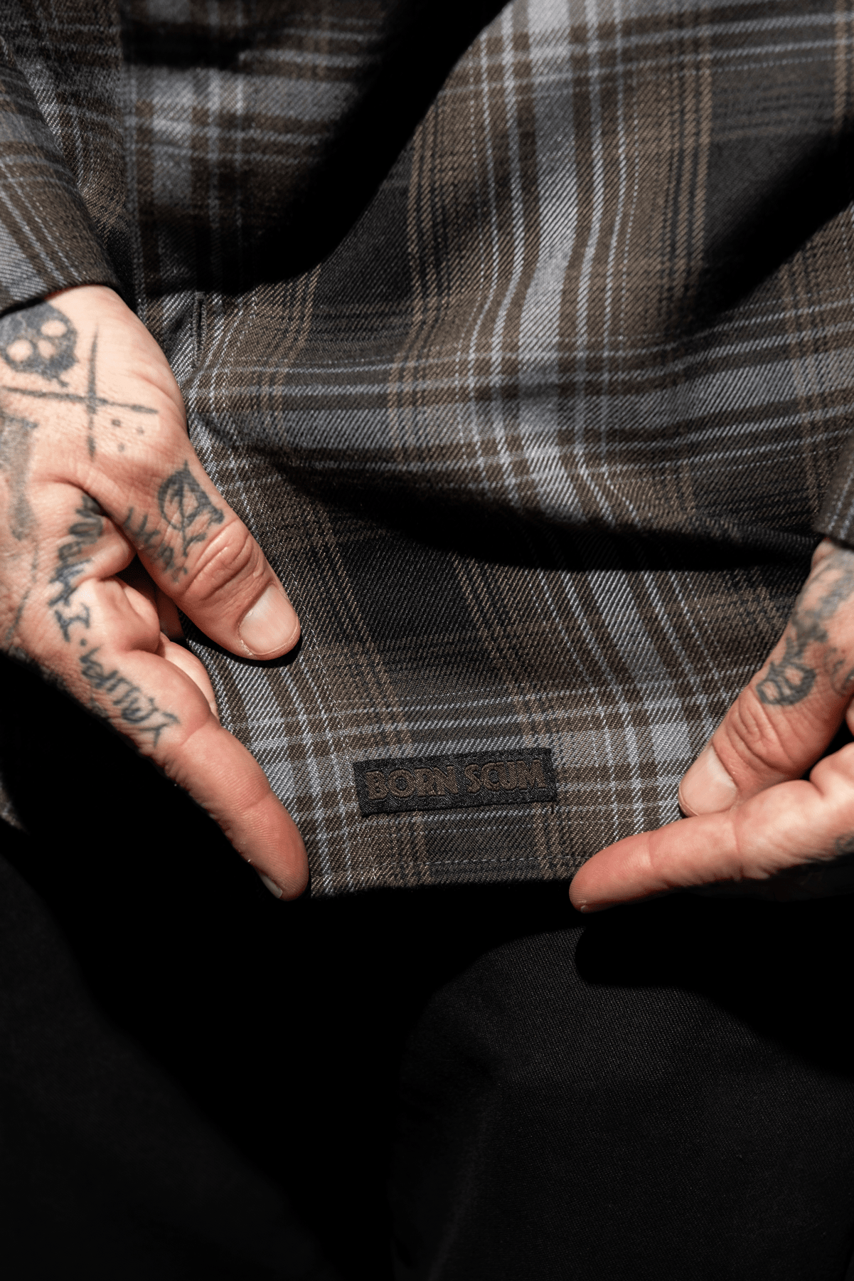 Elevate your wardrobe with the latest Born Scum flannel, designed for those who demand both durability and style. This flannel features a striking gradient gray and black plaid, creating a bold, versatile look that stands out.